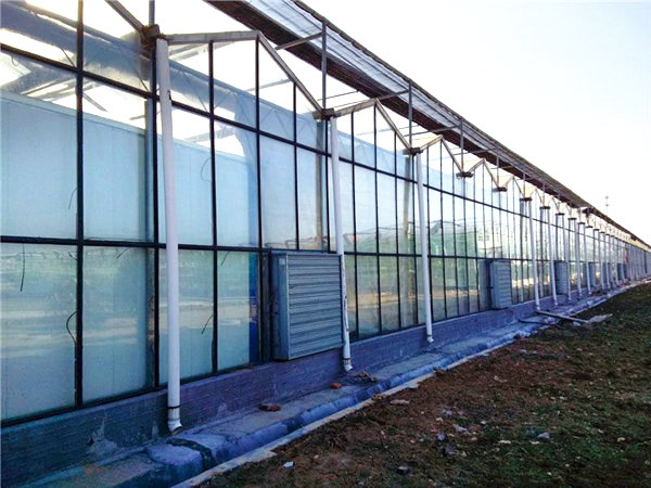 采用熱鍍鋅鋼制骨架,覆蓋材料為5mm鋼化玻璃,透光率在九十以上。溫室大棚頂部及四周為專用鋁型材。溫室大棚頂部為雙向開窗,齒輪齒條副傳動。根據用戶需要,溫室大棚兩個端面可安裝濕簾和風機,也可在兩個端面及側面安裝鋁型材推拉窗、平開窗或外翻窗。