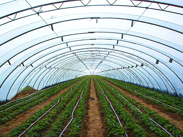 前坡面夜間用保溫被覆蓋,東、西、北三面為圍護(hù)墻體的單坡面塑料溫室,統(tǒng)稱為日光溫室。其雛型是單坡面玻璃溫室,前坡面透光覆蓋材料用塑料膜代替玻璃即演化為早期的日光溫室。日光溫室的特點(diǎn)是保溫好、投資低、節(jié)約能源,非常適合我國經(jīng)濟(jì)欠發(fā)達(dá)農(nóng)村使用。